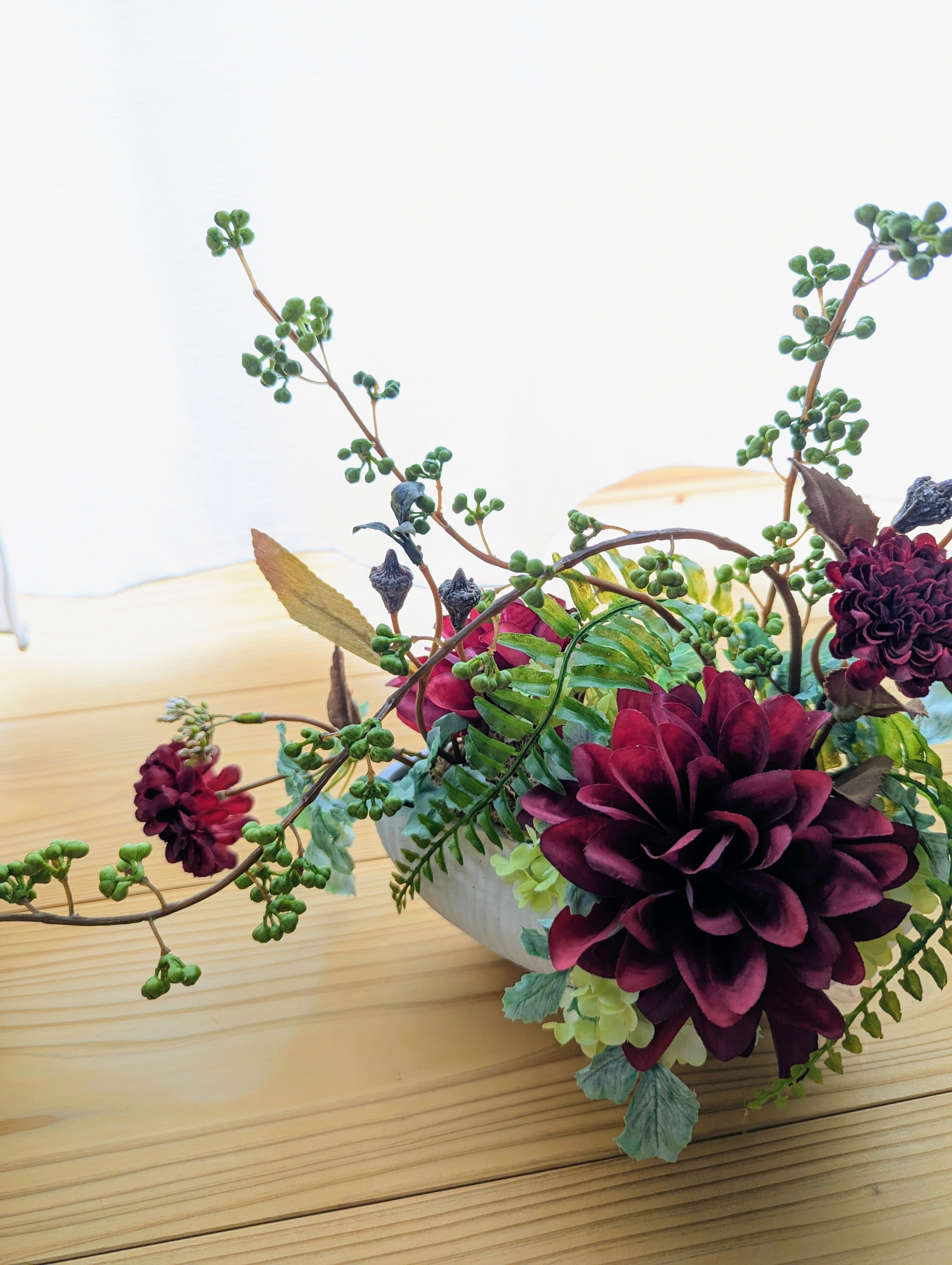 バーガンディーカラーの大人なダリアと、涼し気なグリーンの和テイストのフラワーアレンジメントです。