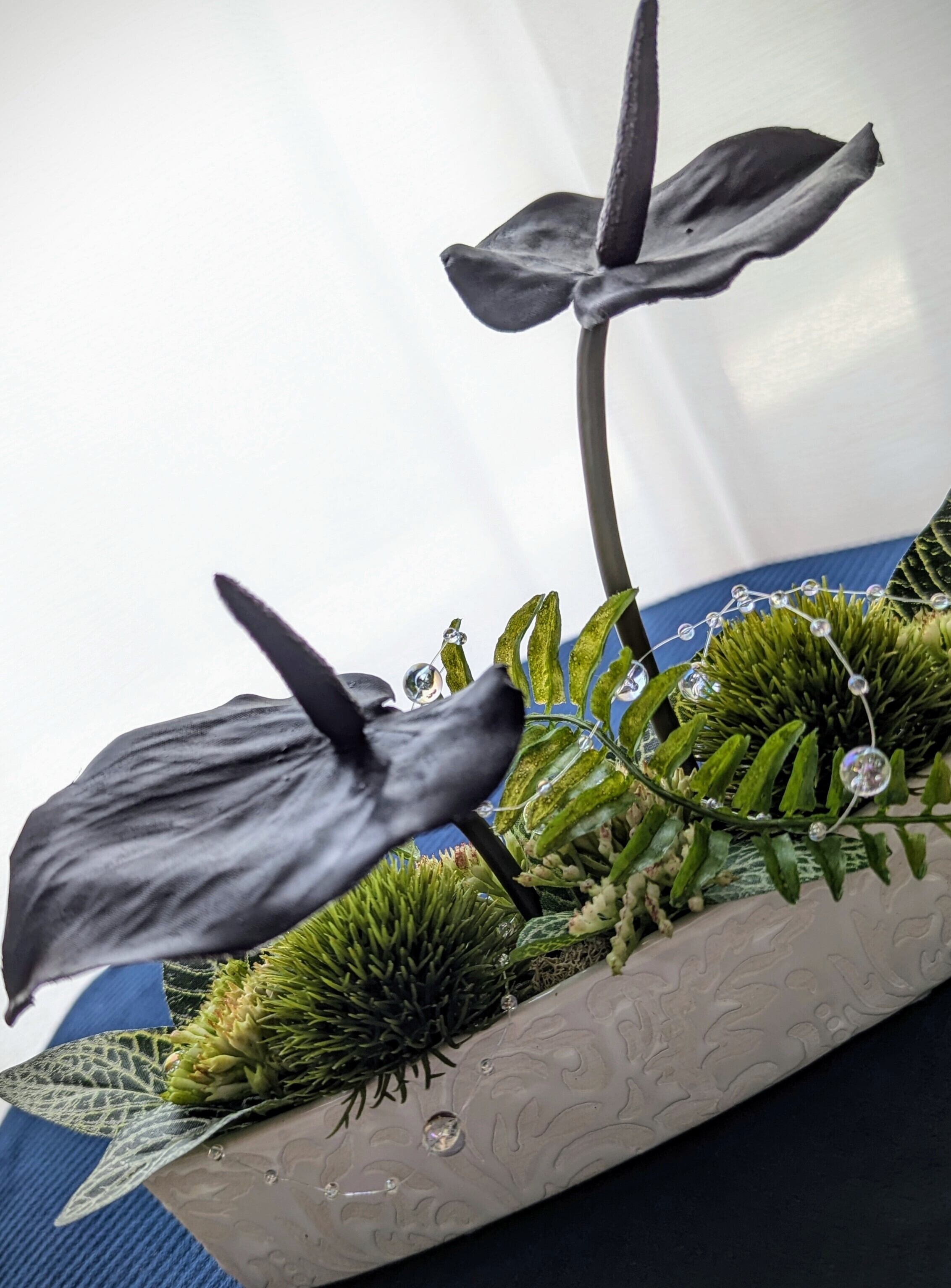 ブラックアンスリウムのグリーンアレンジメント ジャパネスク〜BLKアンス×GRトリュフ×ベンケイソウ アーティフィシャルフラワー