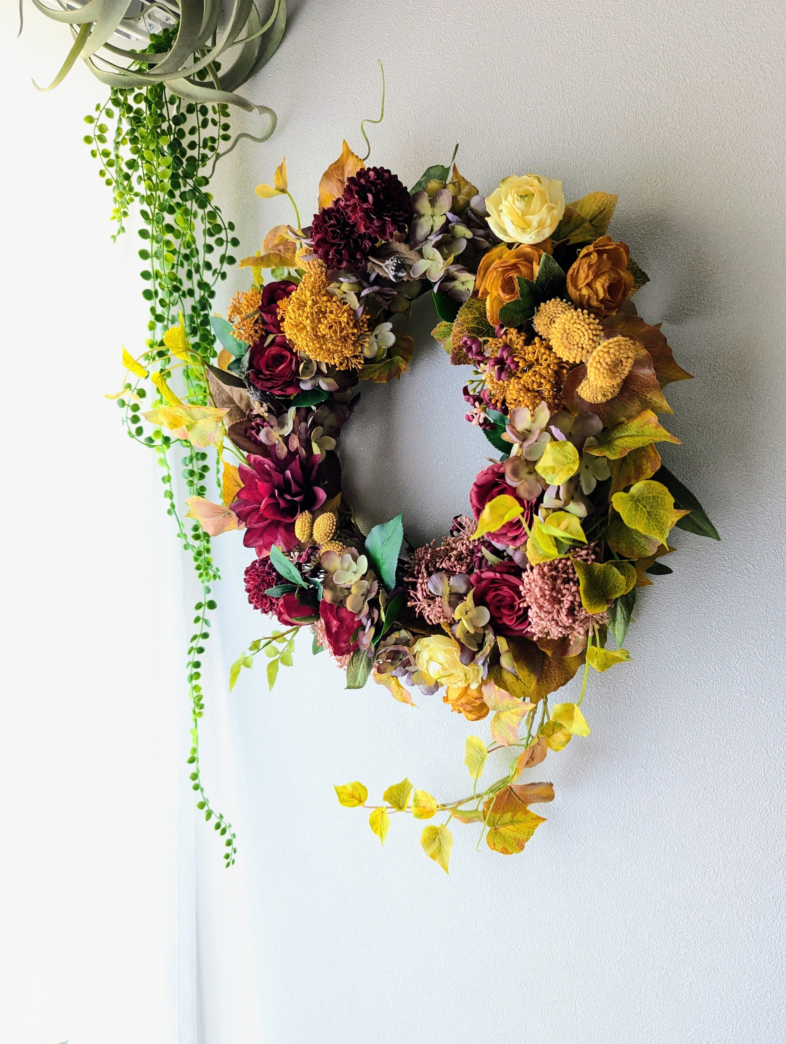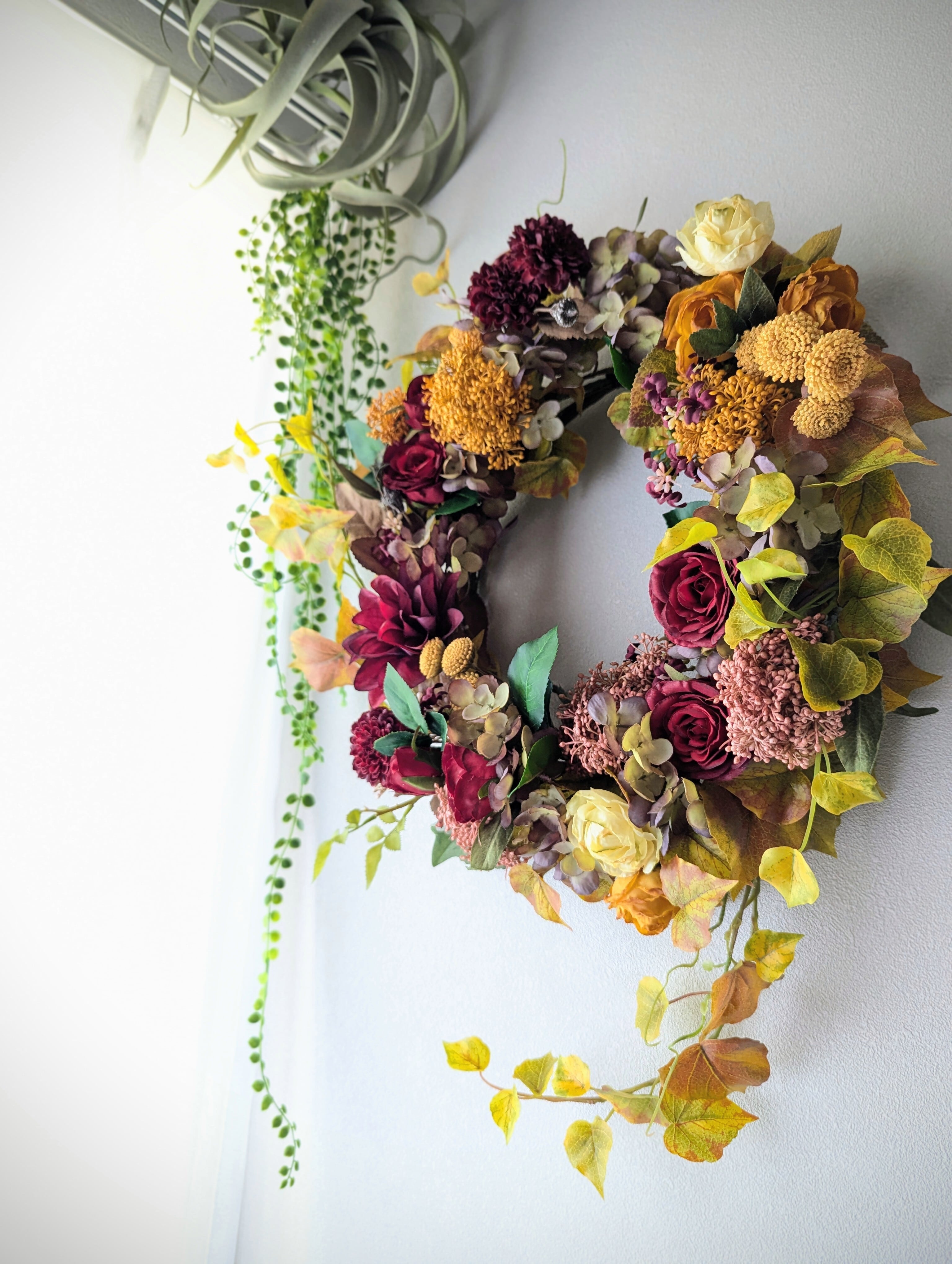 秋色の彩りを贅沢に束ねた、ナチュラルで華やかなリース。