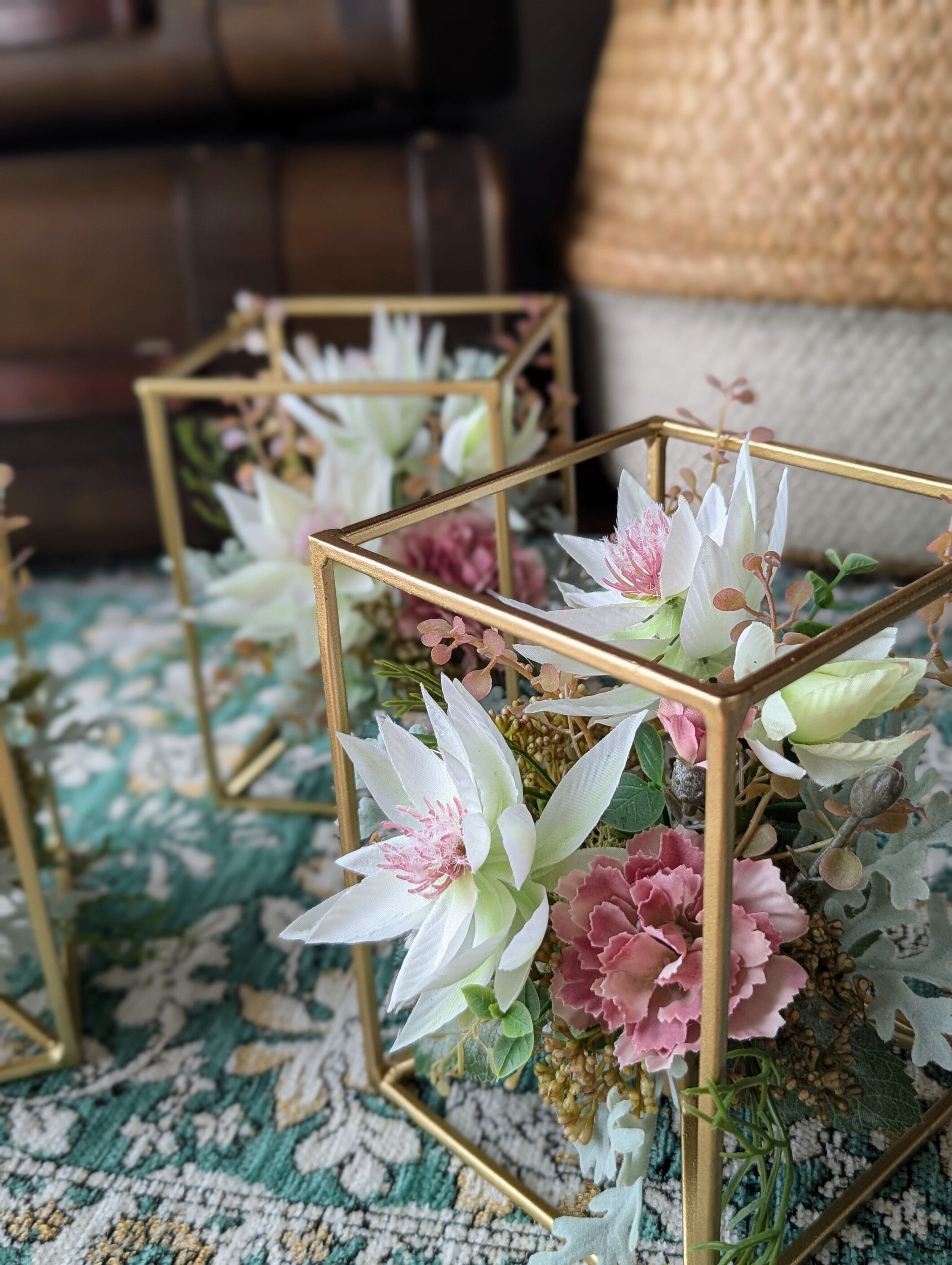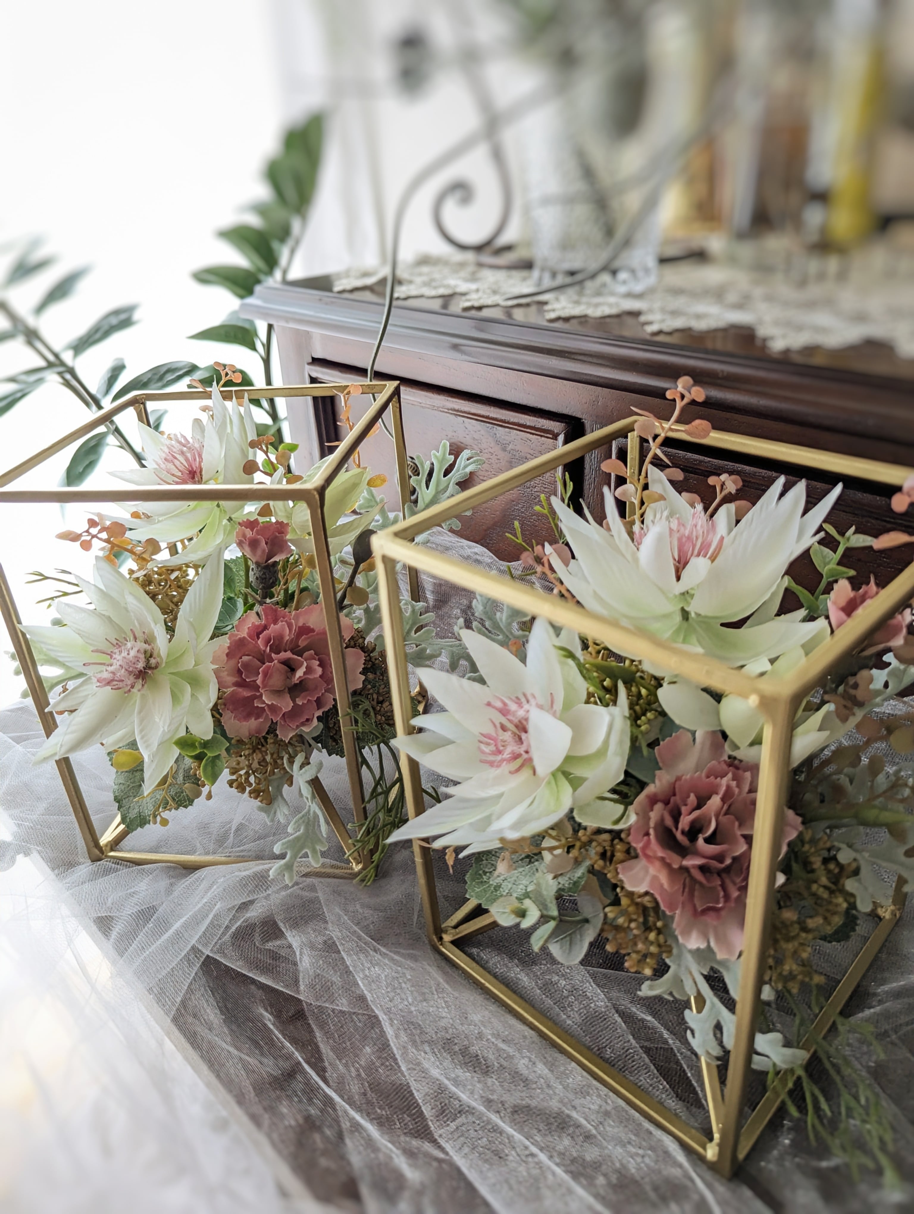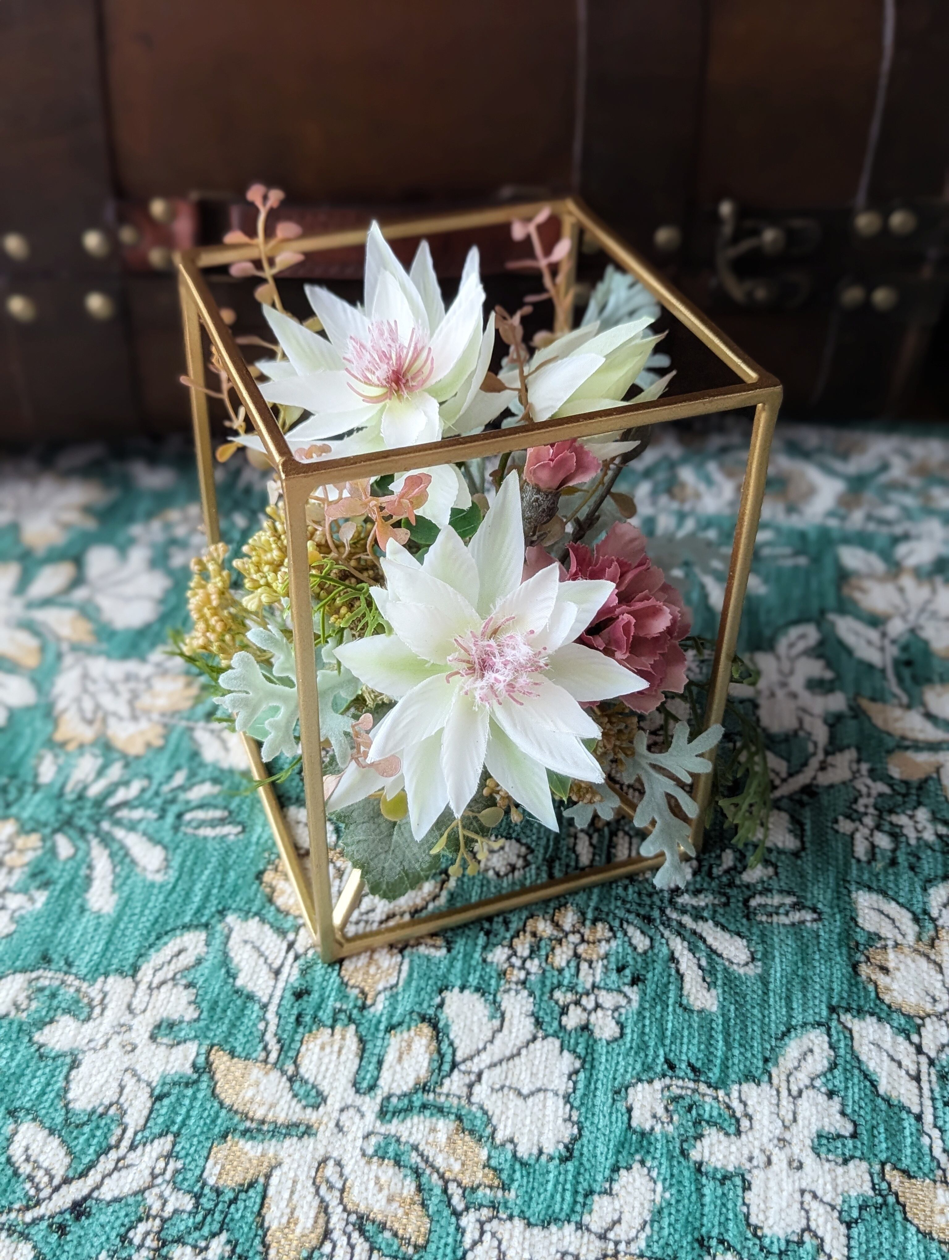 ゴールドフレームの2way仕様で、置いても掛けても立体的に映えるアレンジ。どんな空間にもエレガントに馴染みます。
