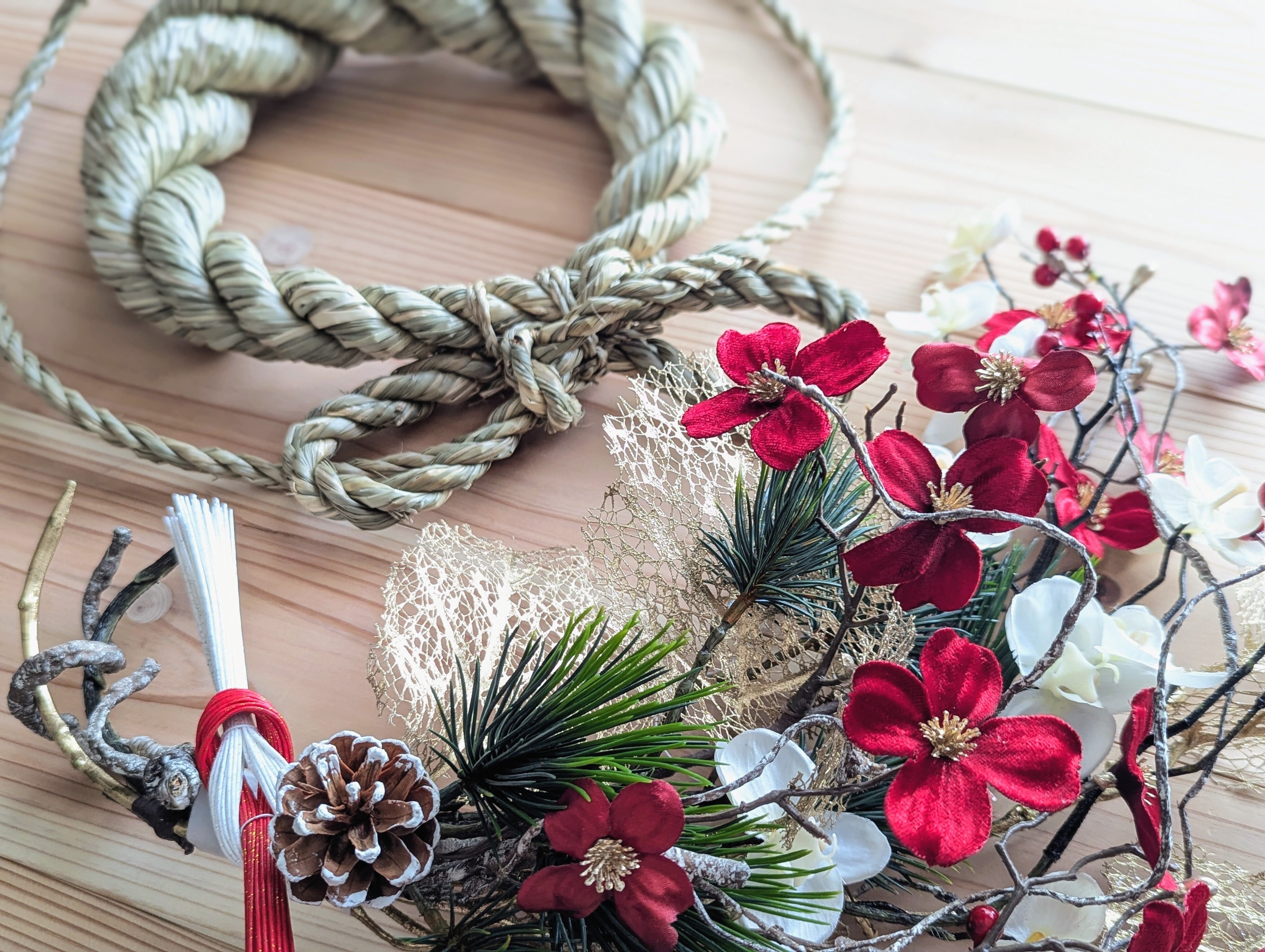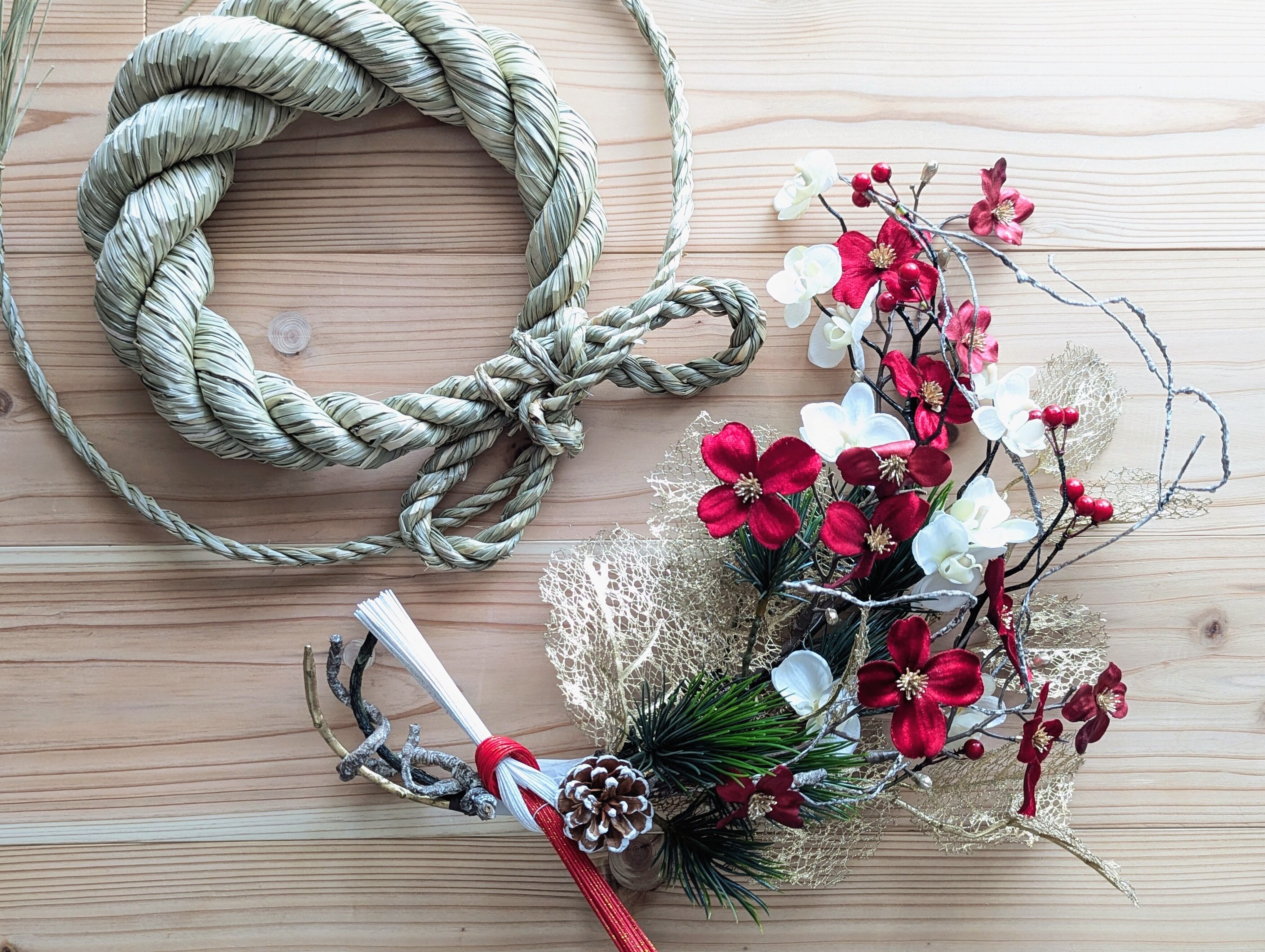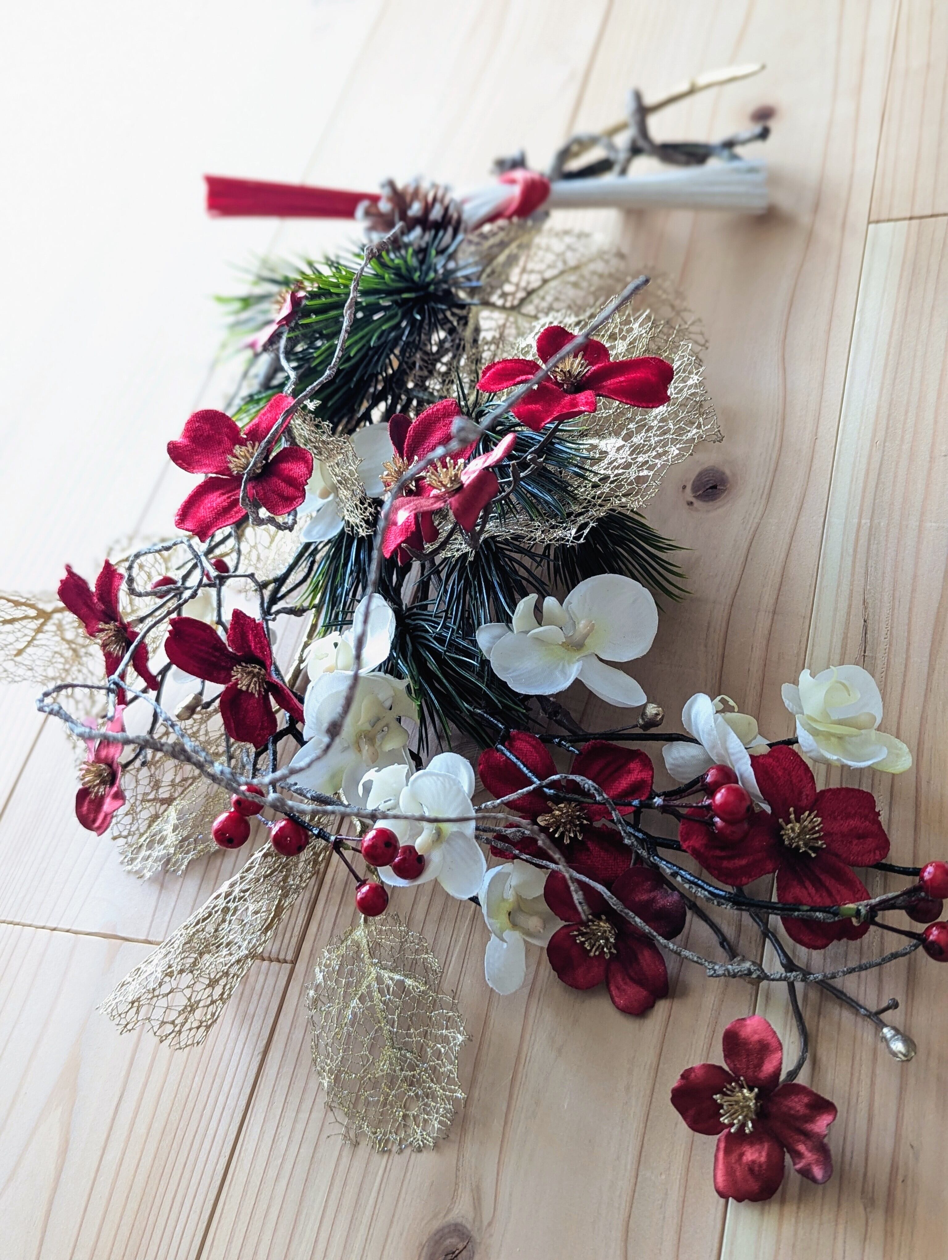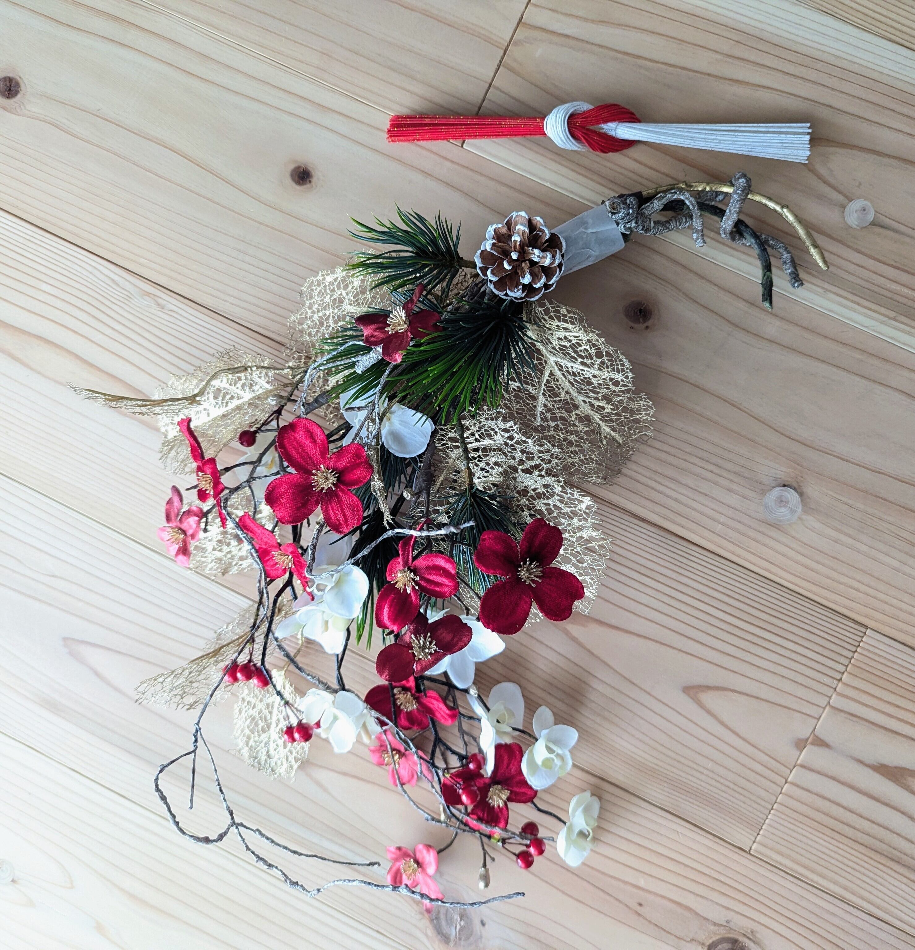 外したあとの和テイストのスワッグは、そのまま飾っても良いですし、水引の代わりにお手持ちのリボンやタッセルなどを付けたりして、ひと手間加えてオリジナルで楽しんでくださいませ。