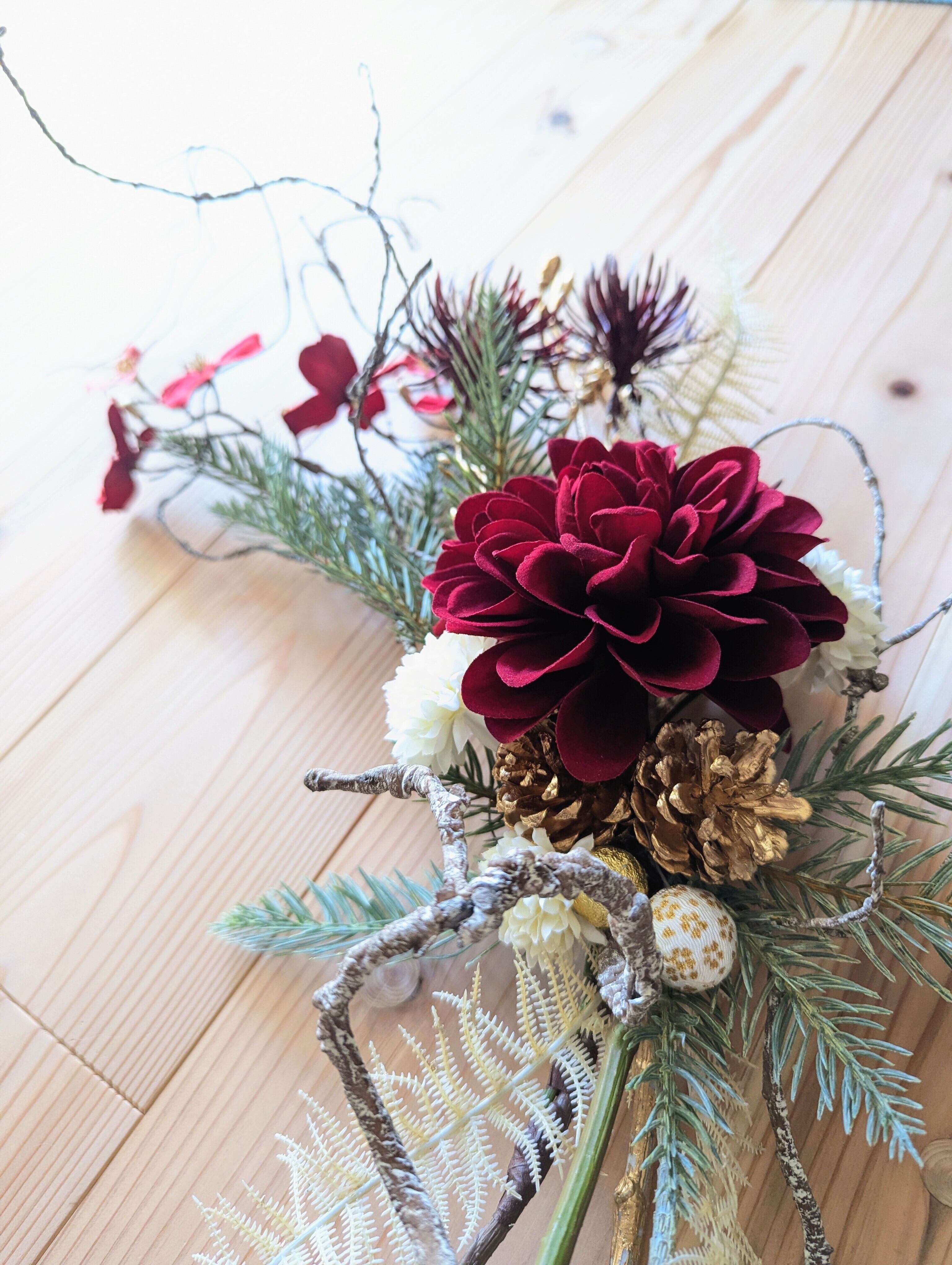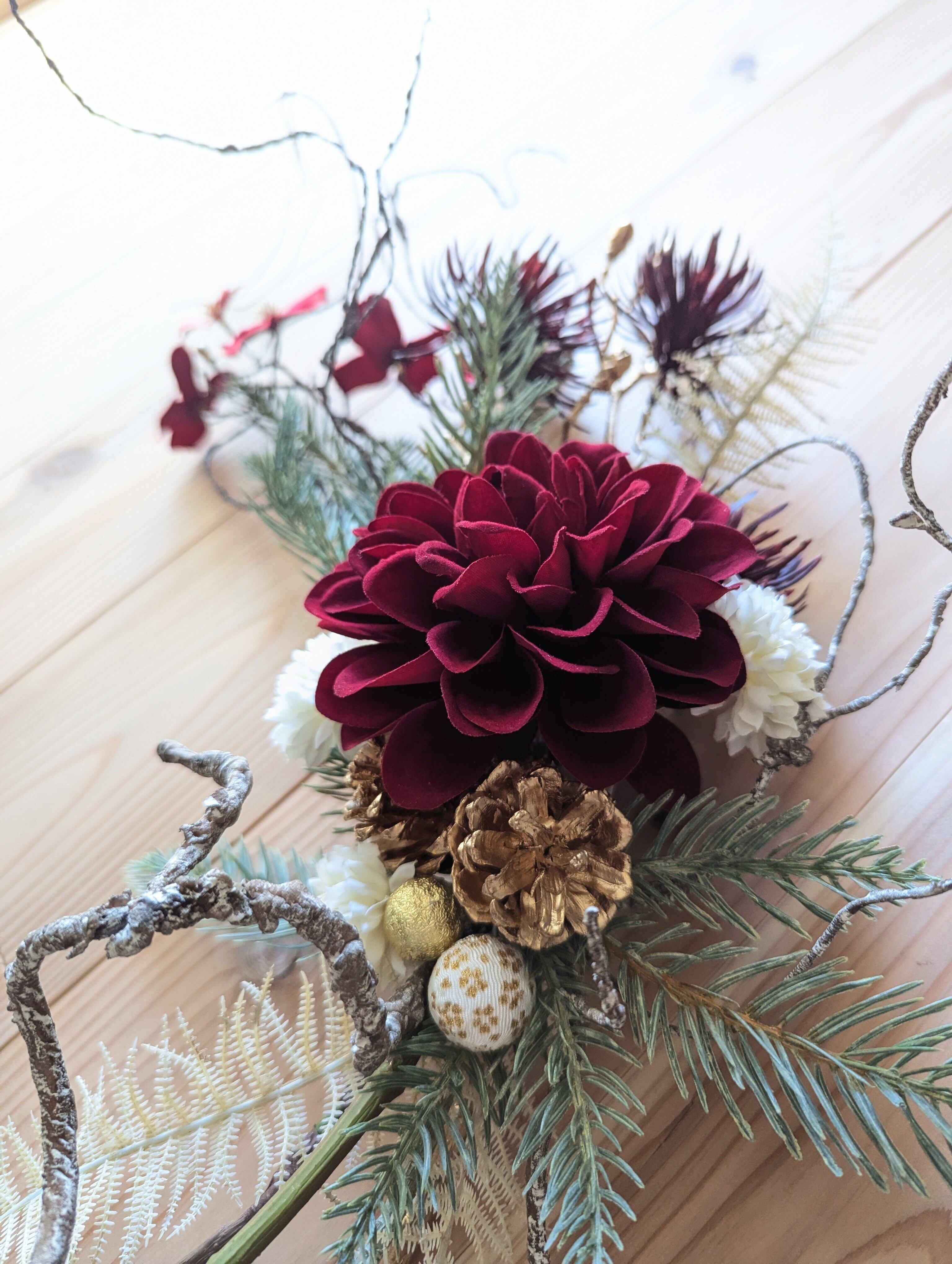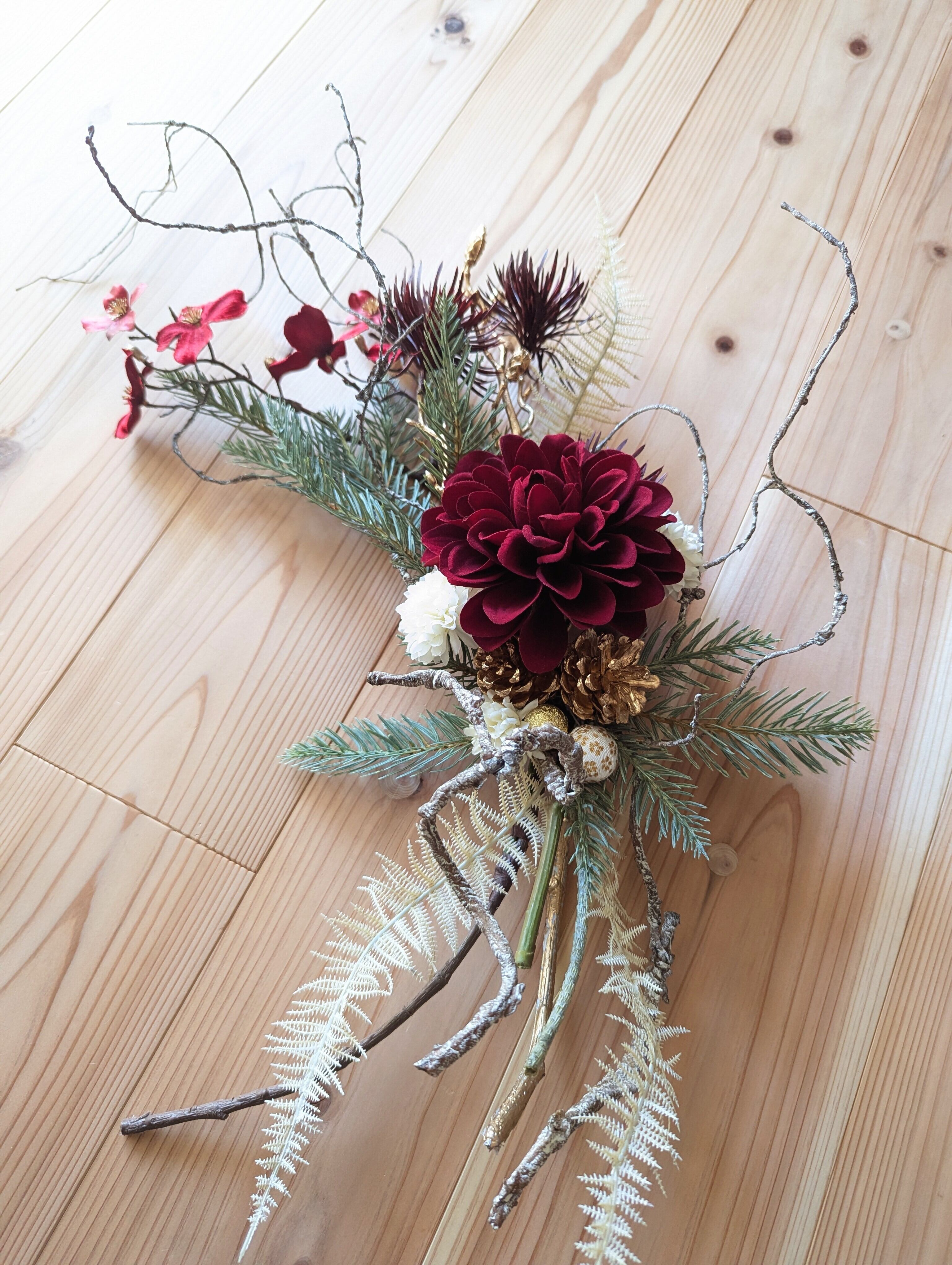 紅白の色合いに、白いマムとスワッグのアクセントとなるドライテイストのシスターファーンをあしらって繊細な表情を。