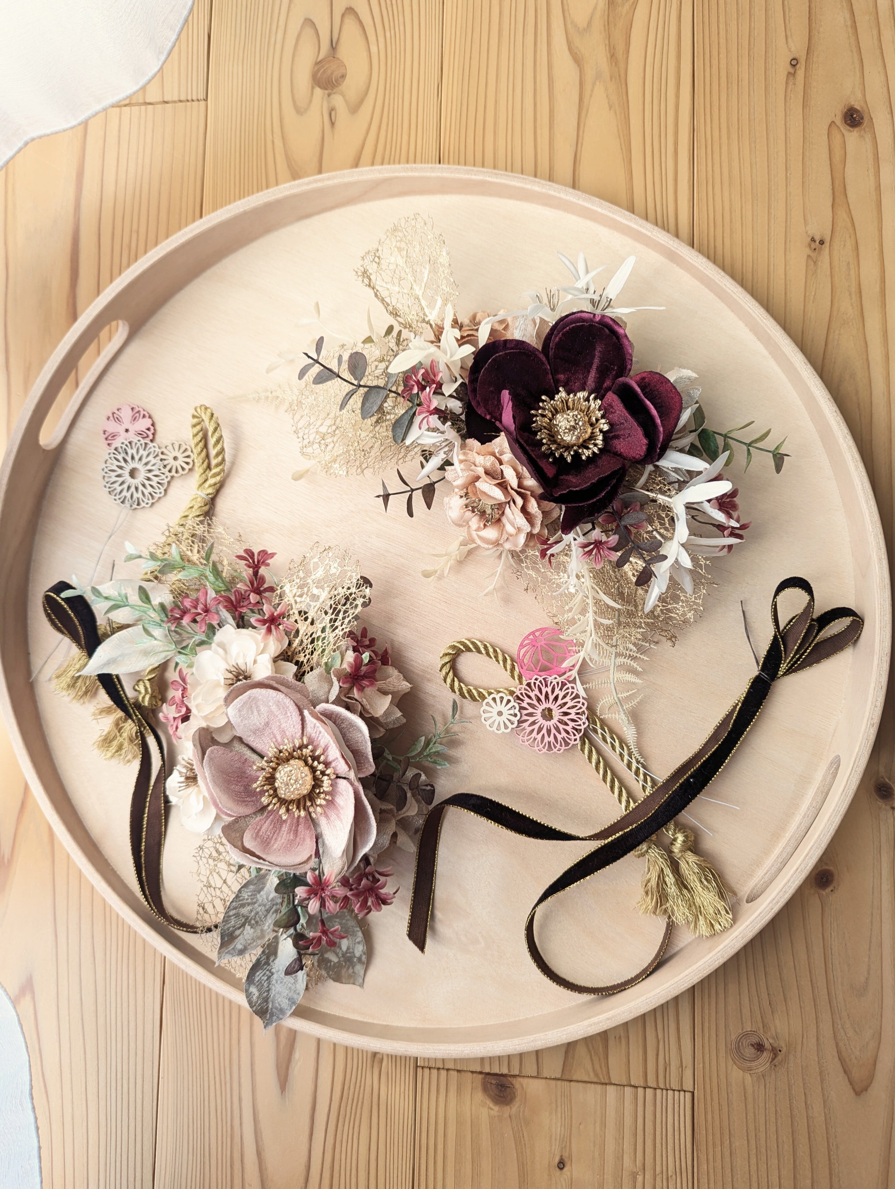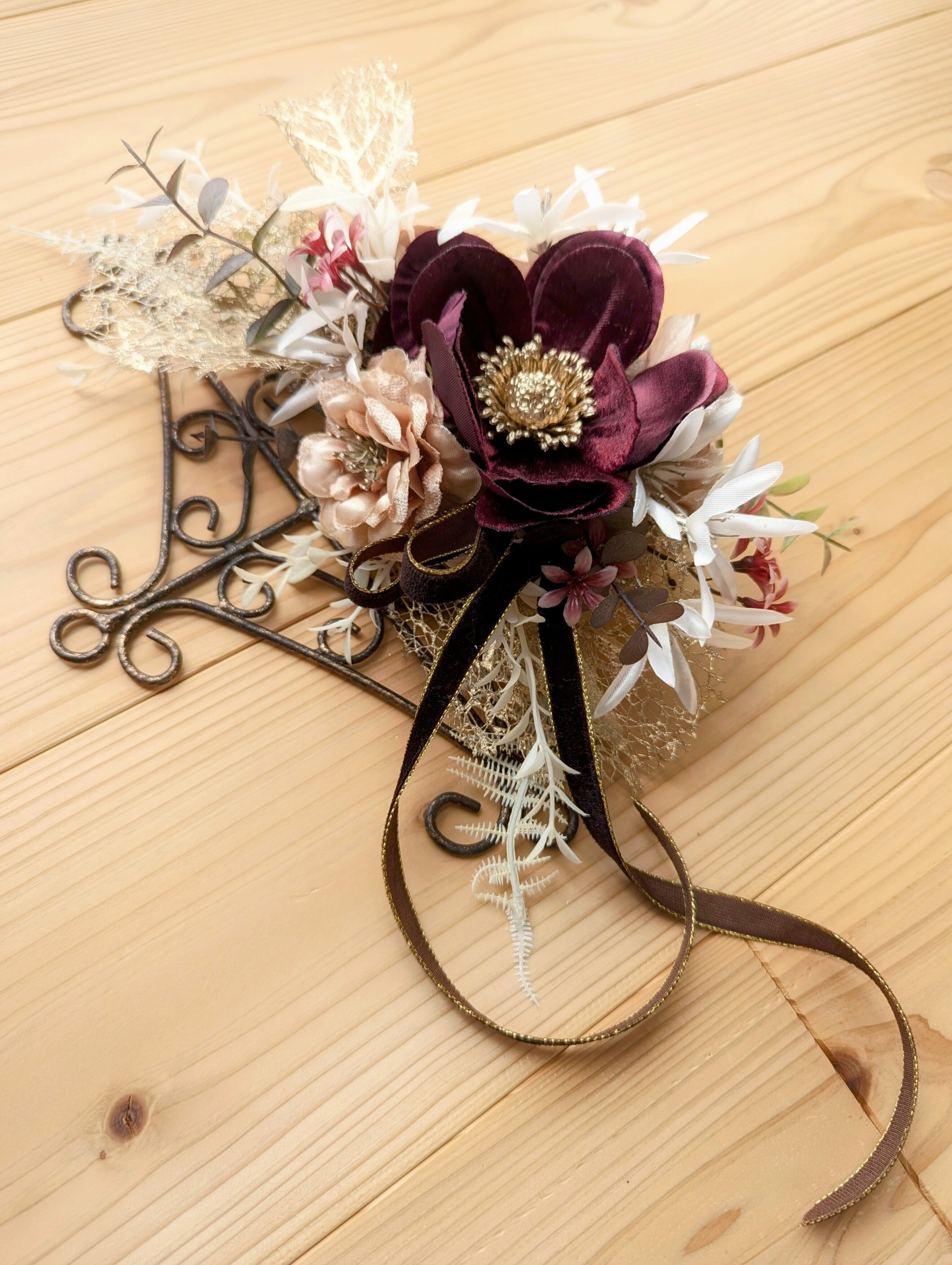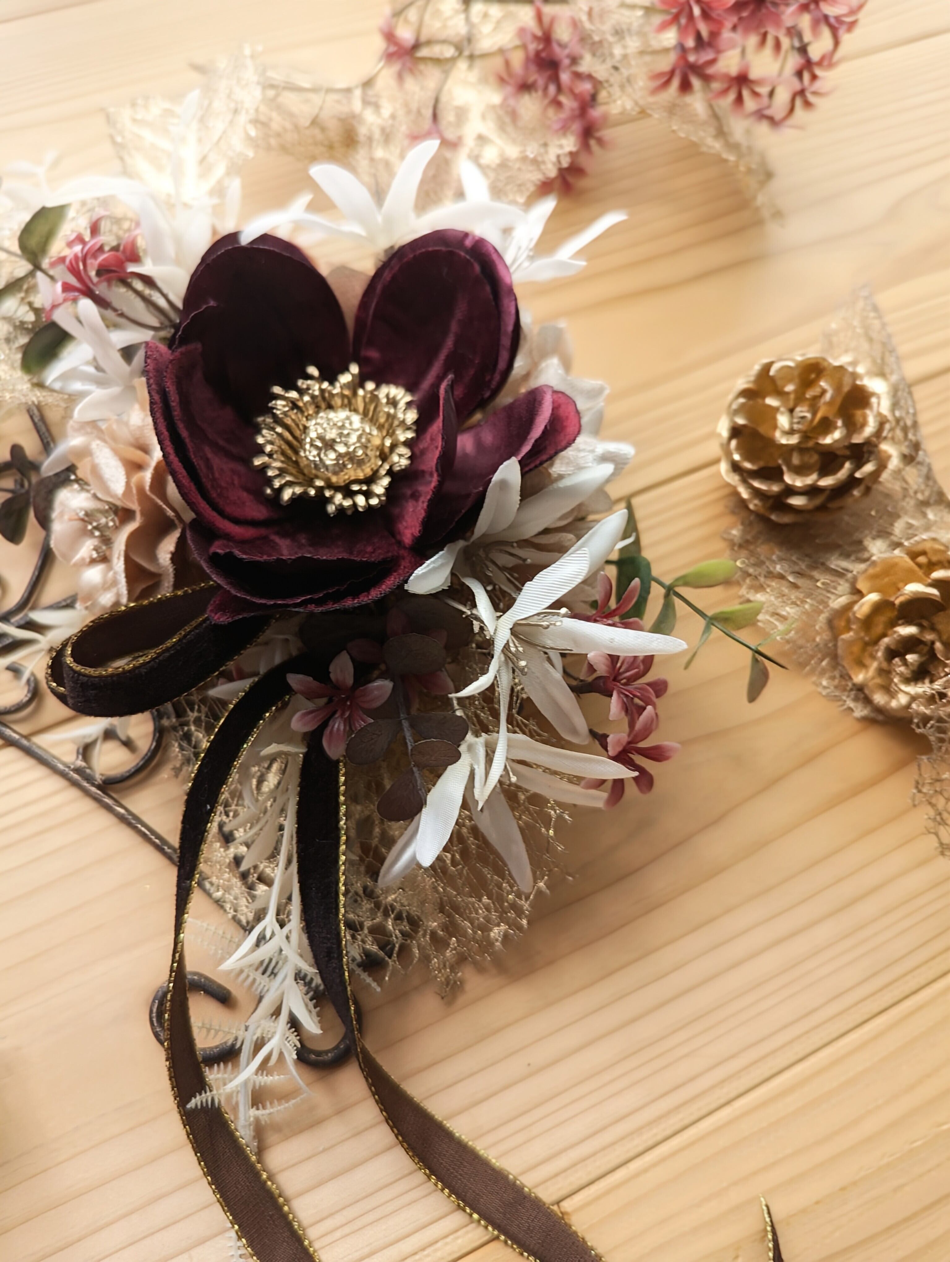 こちらに合わせる際には、ゴールドエッジの効いたベルベットのリボンをあしらってやさしい洋の表情に。
