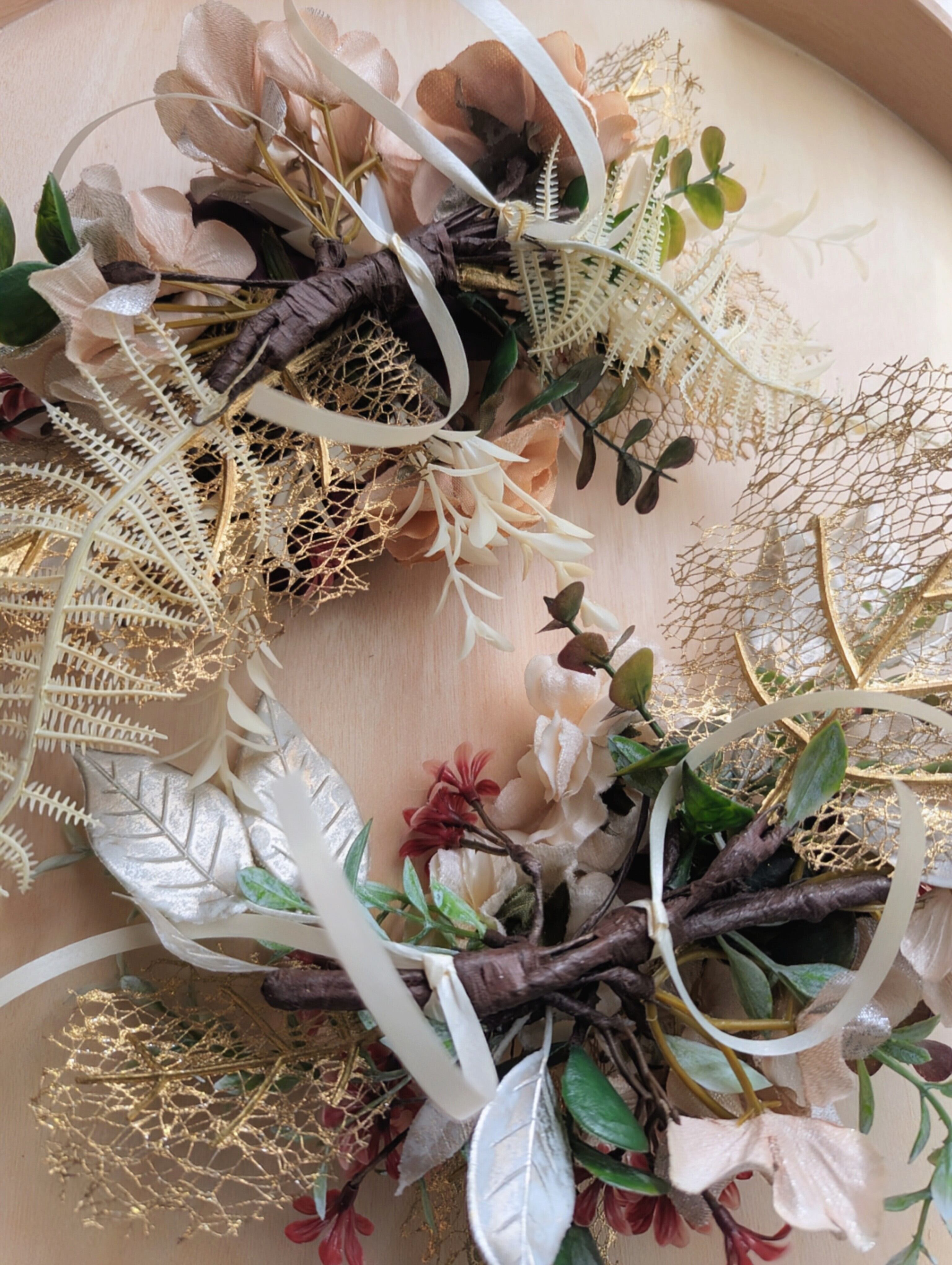 葉ものには、繊細なレースが軽やかな金のグレープリーフ、ドライな質感のシースターファーンやアイボリーのルスカスを。