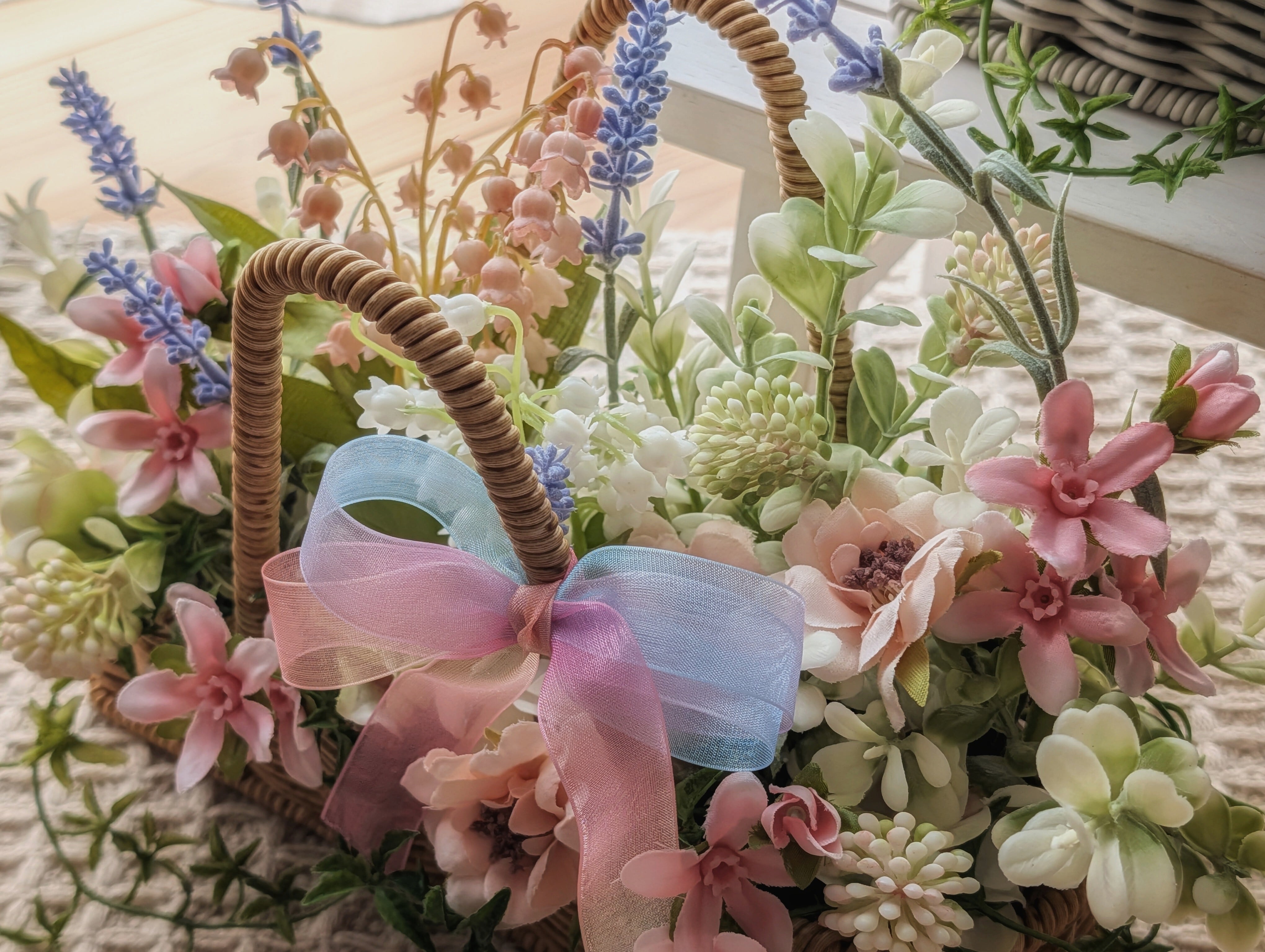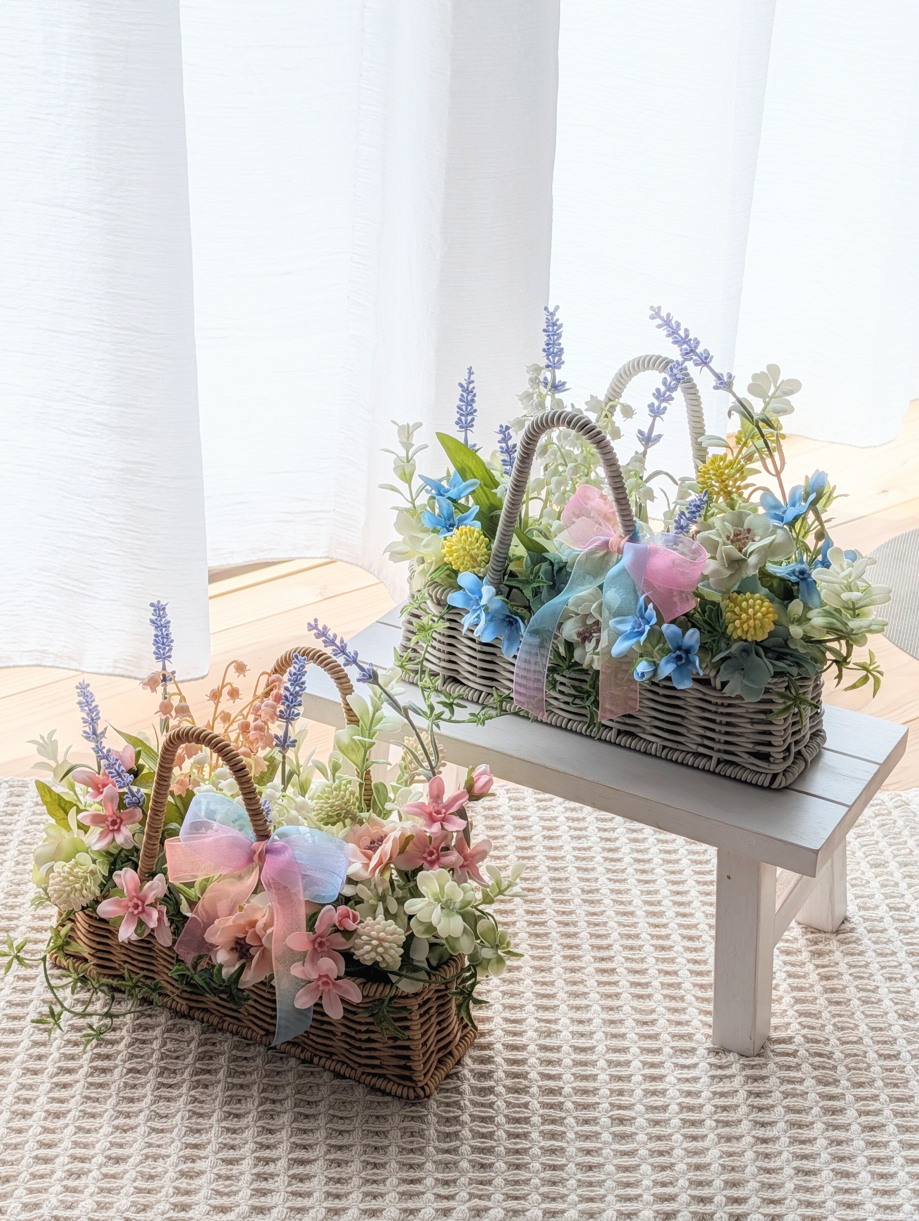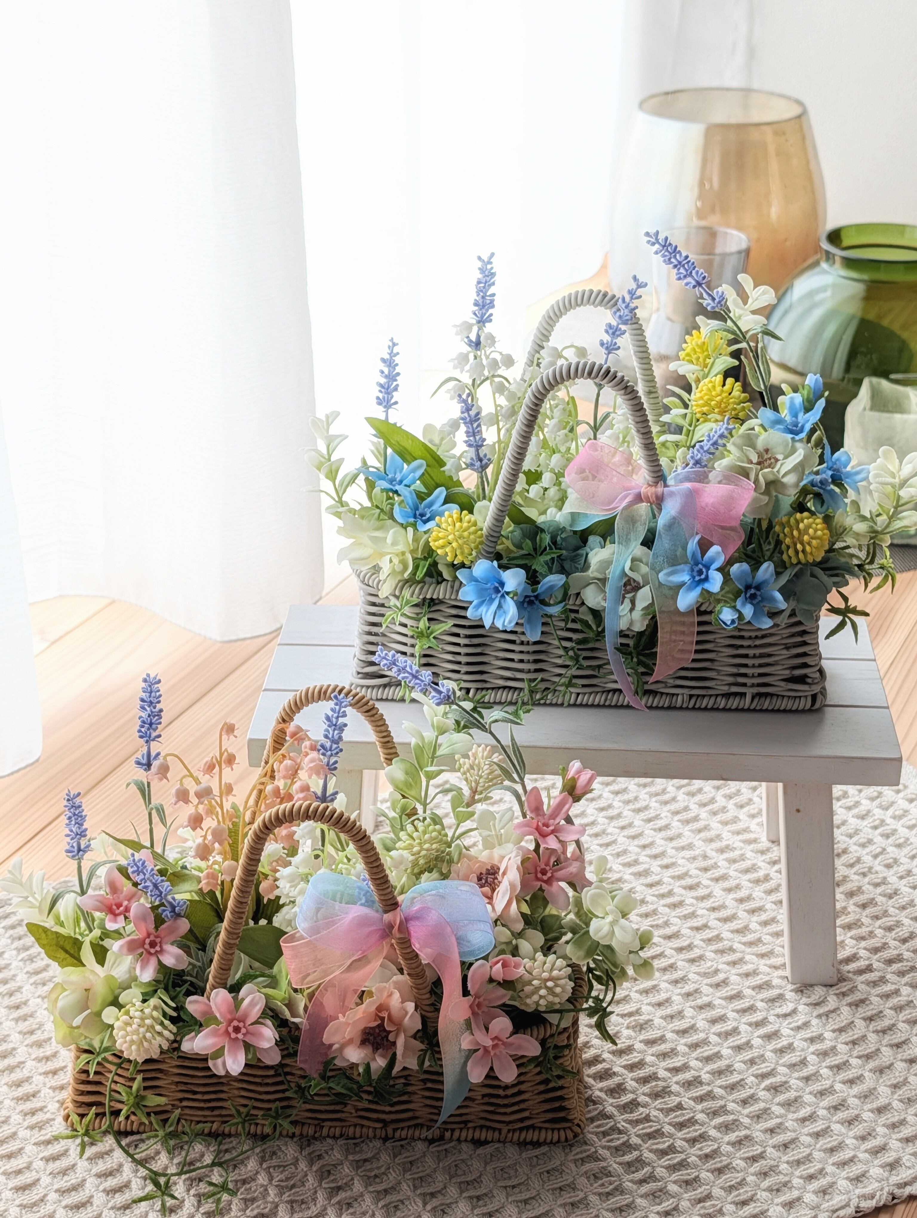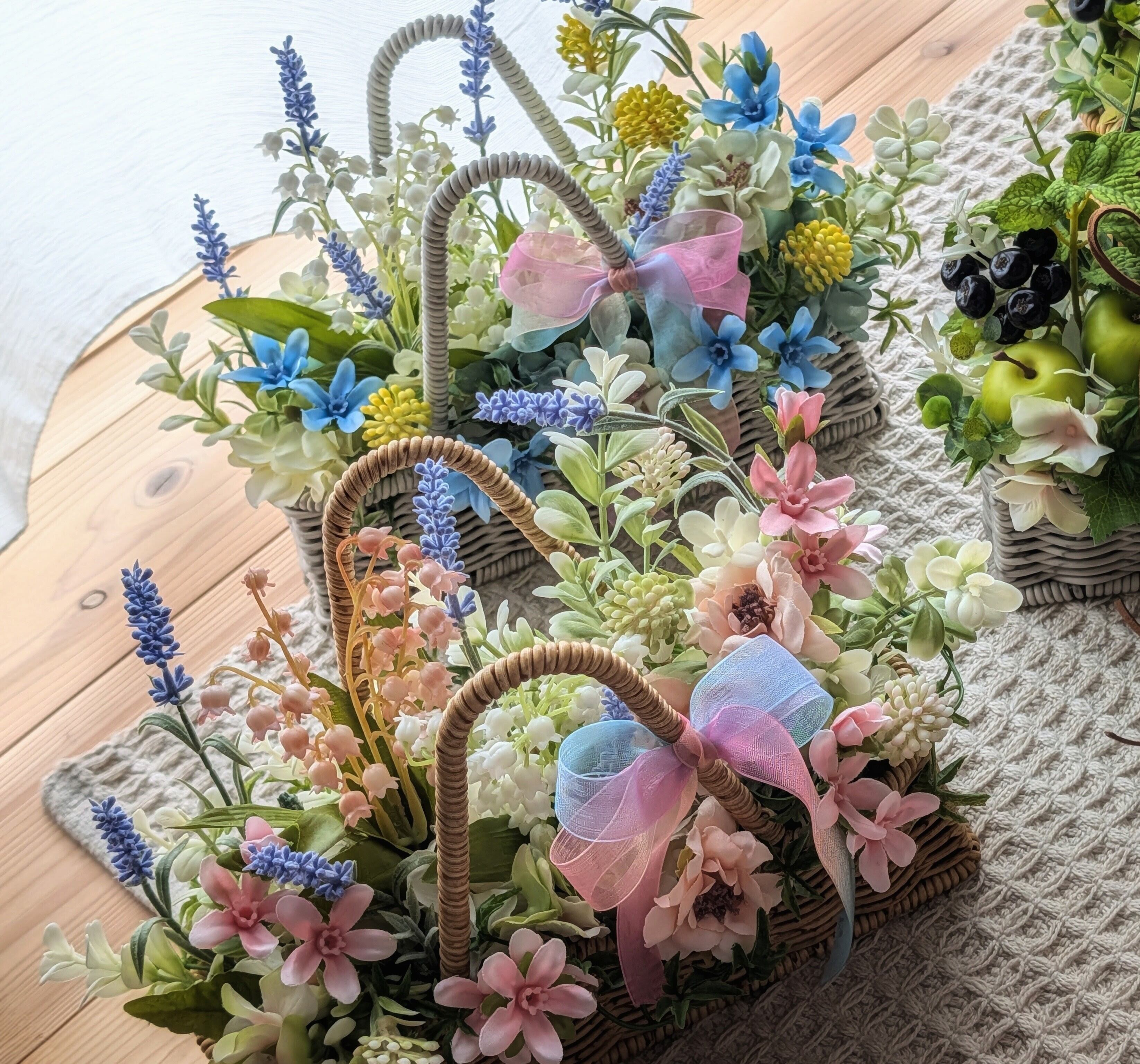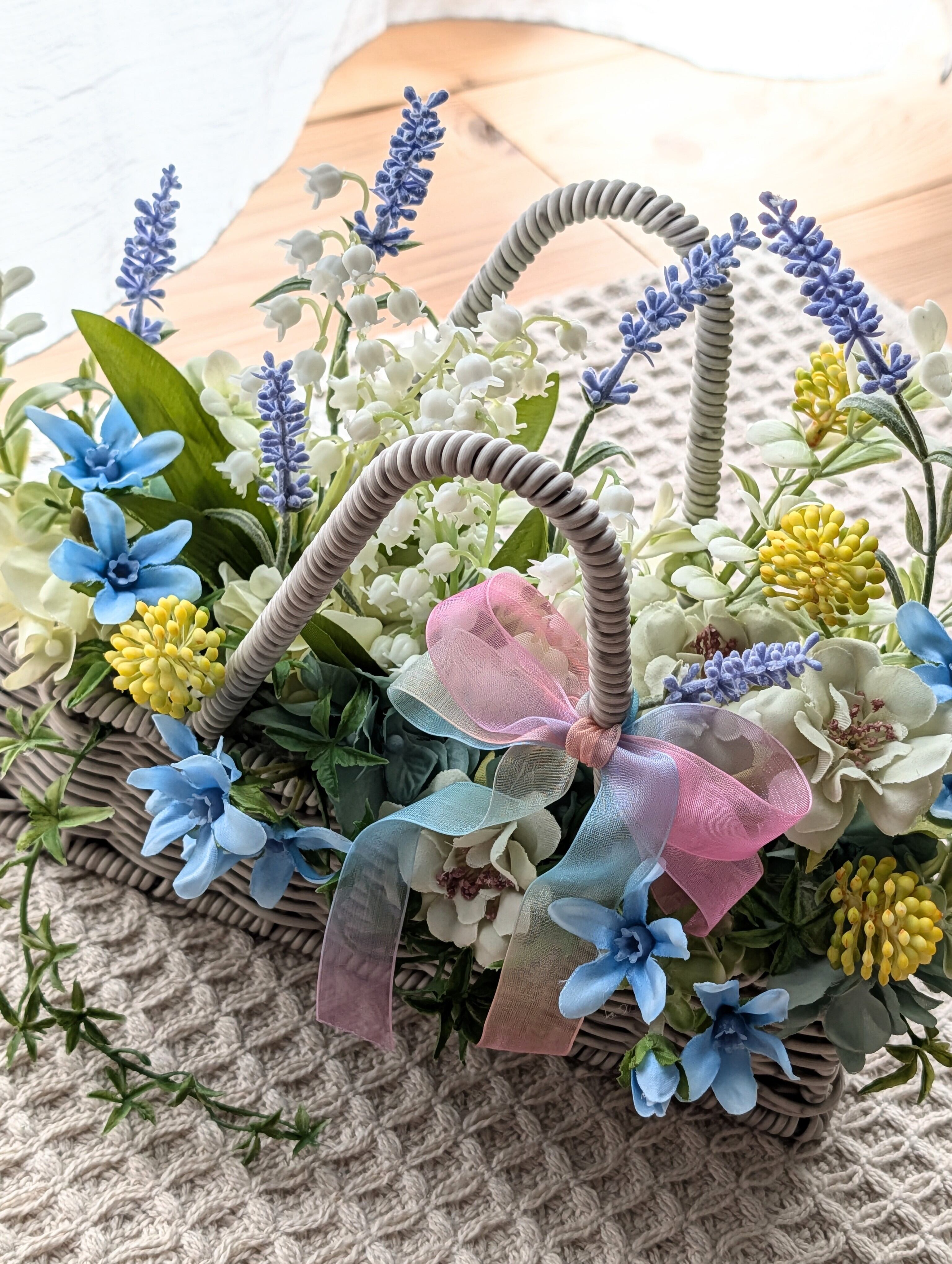ミュゲとラベンダーのパニエ・ド・フルール〜爽やかガーデンアレンジメント 置き/壁掛け 2way PK/BL ギフト 母の日
