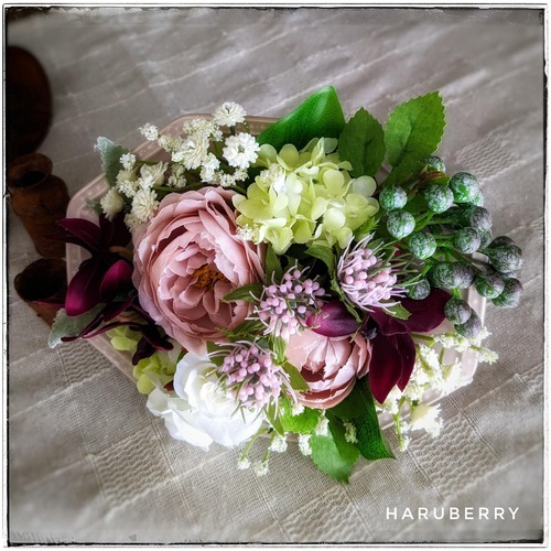 陶器Pinkフレームフラワーアレンジメント~ナチュラル♡オールドローズ