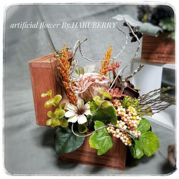 Sold outこちらはウッドボックスのフラワーベースにアーティフィシャルフラワー(高品質な造花)でアレンジしています。