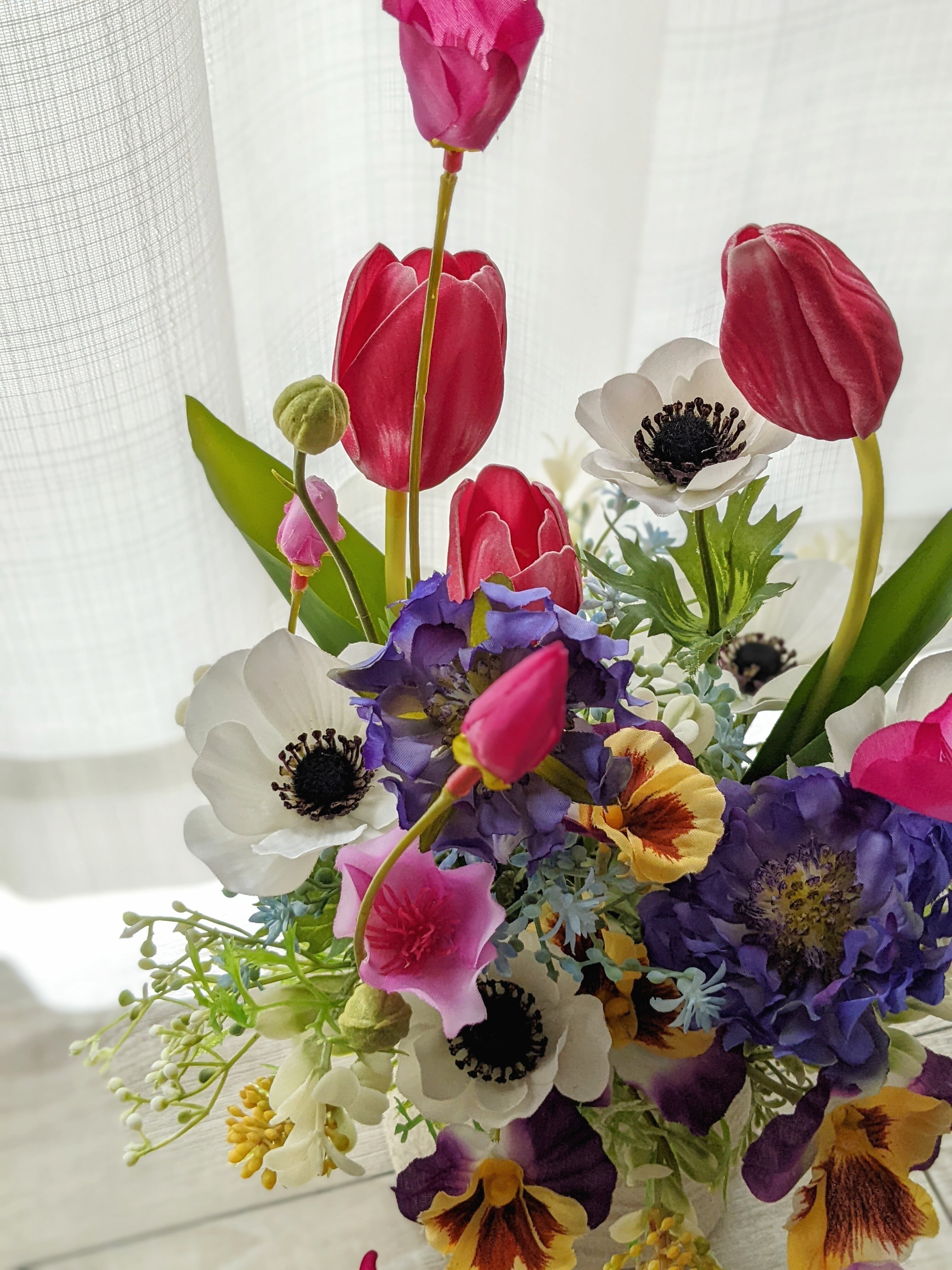 可愛らしい濃いめピンクのチューリップ、ひらひらと美しいホワイトのアネモネ、ブルー系で引き締まる柔らかなスカビオサ、