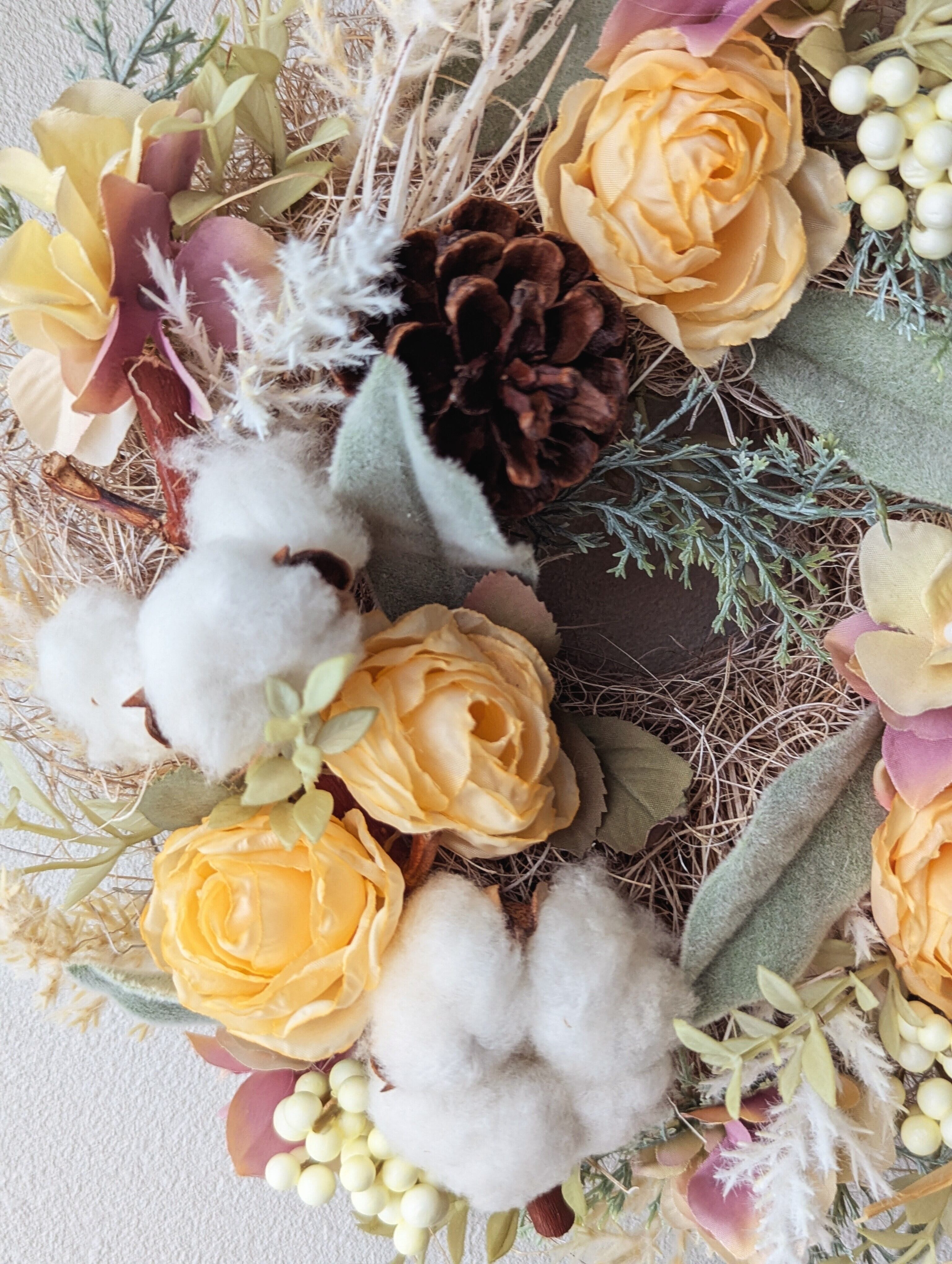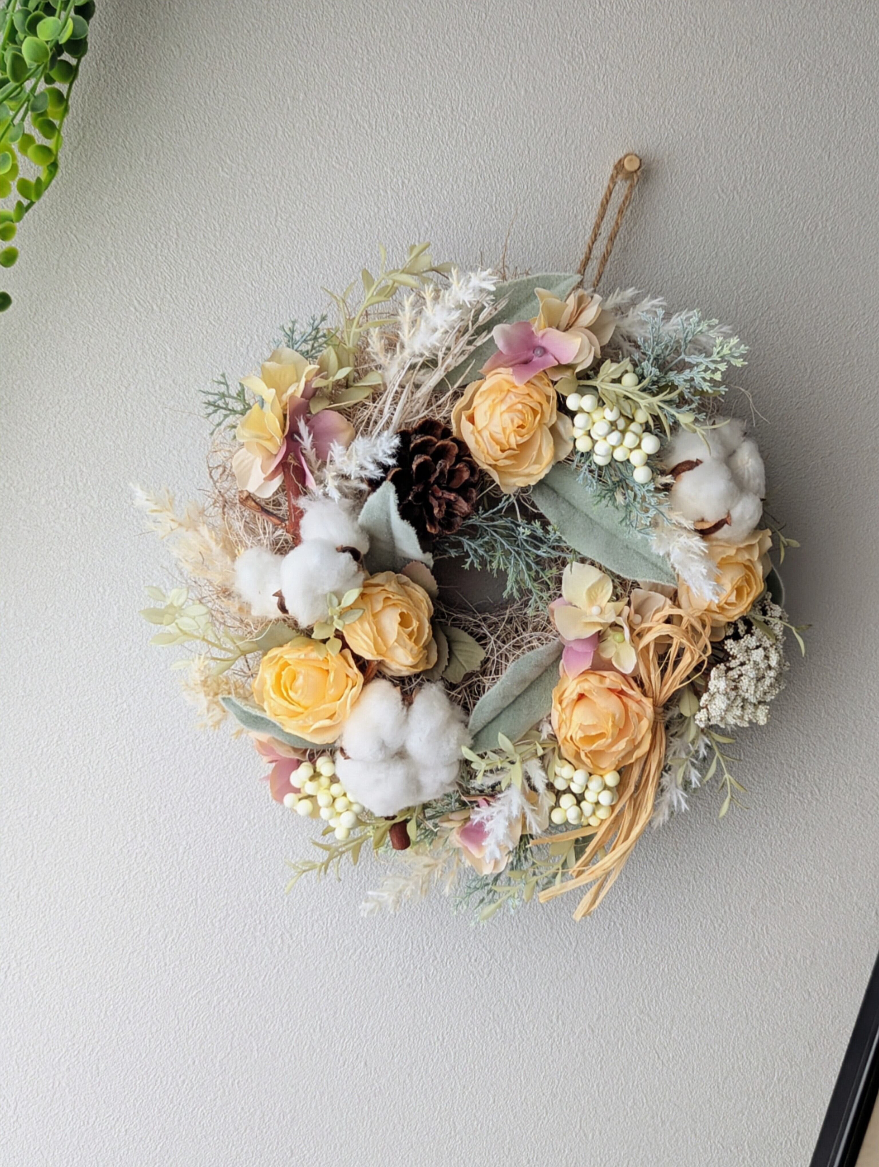 アーティフィシャルフラワーとドライフラワーをミックスで楽しめ、心がほっこりする雰囲気に仕上がりました。ほんわか、ふんわりな温かいリースです。