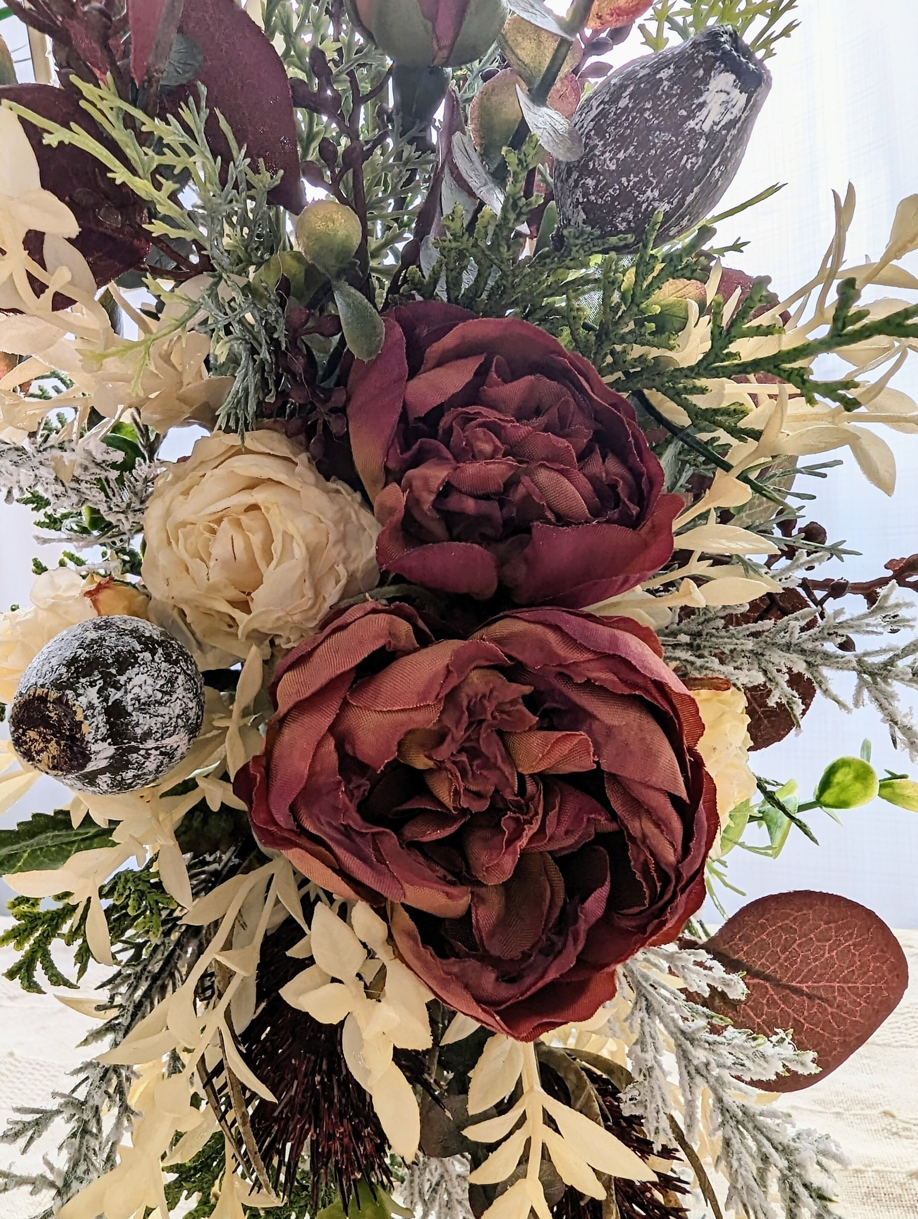 赤紫に黄味がかったドライドローズローズに、クリーム系のドライドローズ、バーガンディーカラーのアザミやユーカリと、