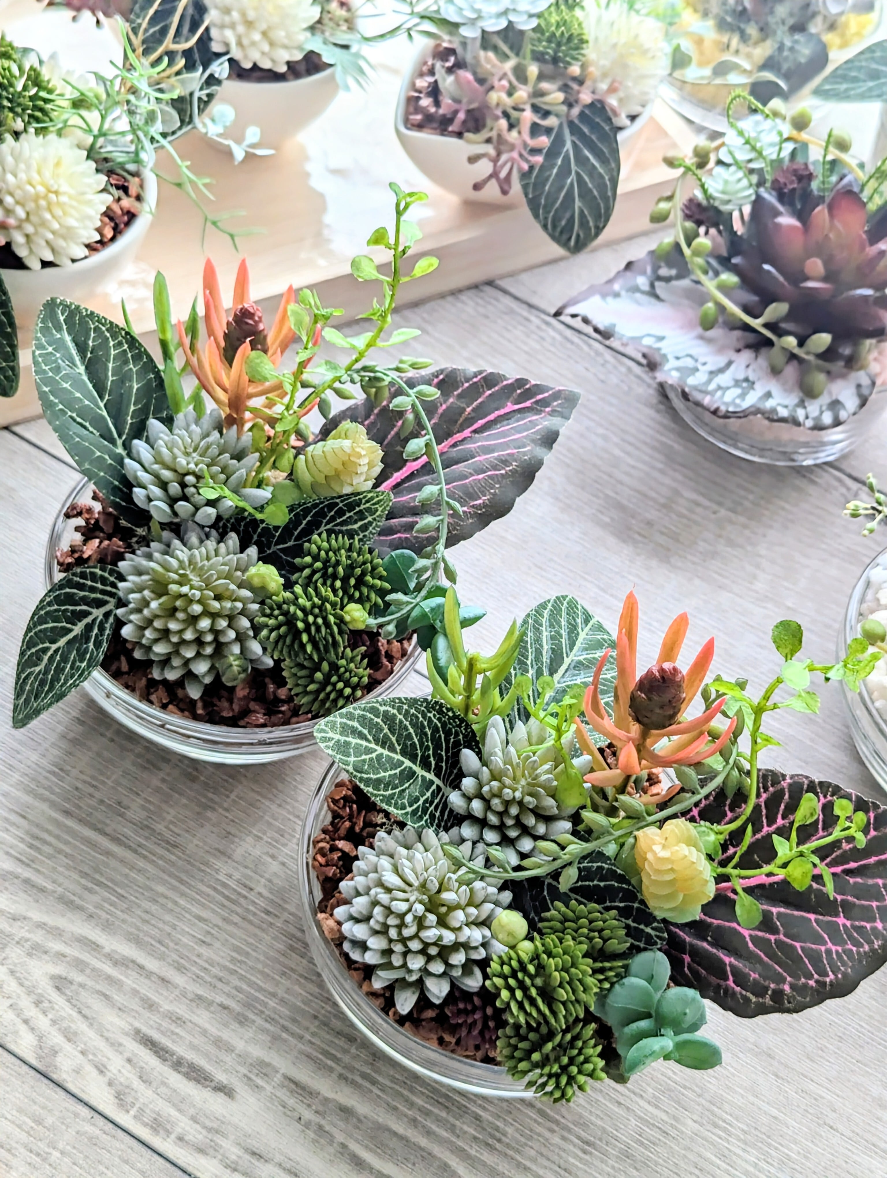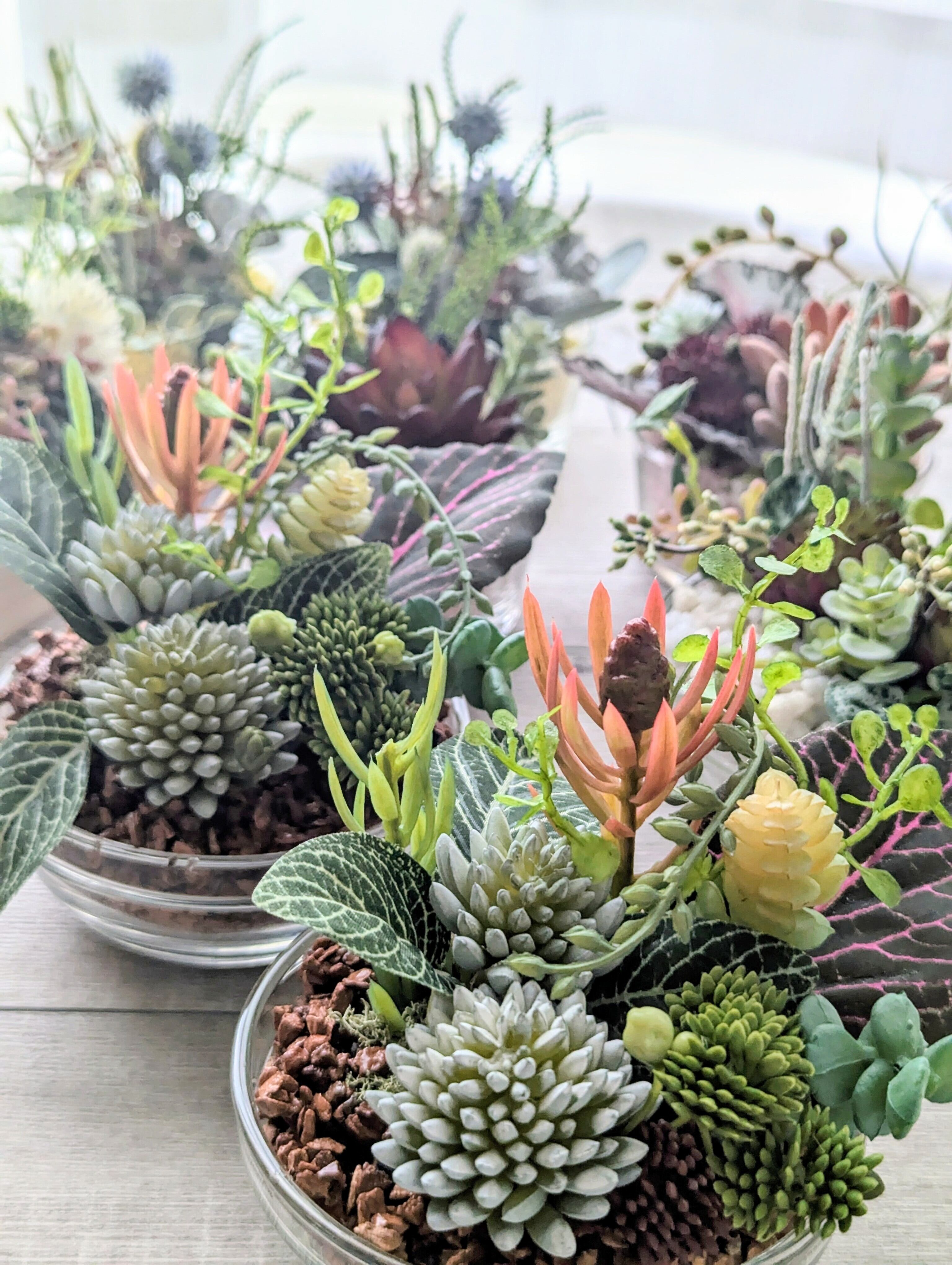 小さなスタックボウルに色々な多肉やグリーンを寄せ植え風に小さくクールにアレンジしました。